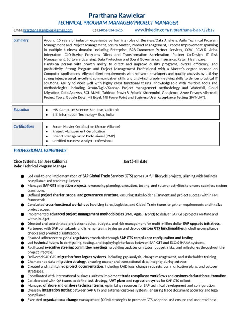 Prarthana Kawlekar is a Technical Program Manager with around 15 years of experience in various roles including Business/Data Analysis, Project Management, and Scrum Master across multiple domains. She has a Master's degree in Computer Science and holds several certifications including PMP and Scrum Master. Currently, she leads SAP Global Trade Services projects at Cisco Systems, managing cross-functional teams and ensuring compliance with trade regulations.