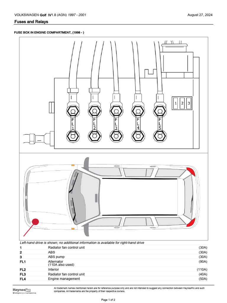 The document provides information about the fuse box in the engine compartment of the Volkswagen Golf IV 1.8 (AGN) model from 1997 to 2001. It lists various fuses and their corresponding amperage ratings for components such as the radiator fan control unit, ABS, alternator, and engine management. The document specifies that the information is applicable to left-hand drive vehicles, with no details for right-hand drive versions.