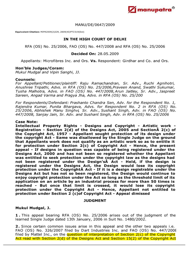 The High Court of Delhi dismissed the appeal by Microfibres Inc. against Girdhar and Co. regarding the protection of their design under copyright law, ruling that the designs were capable of registration under the Designs Act but were not registered, thus disqualifying them for copyright protection. The court emphasized that the designs did not meet the criteria of 'artistic work' under the Copyright Act, as they were intended for industrial use and lacked independent artistic existence. The judgment clarified the interplay between the Designs Act and the Copyright Act, concluding that the appellant failed to fulfill the necessary legal requirements for protection under either act.