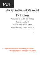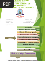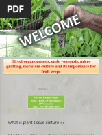 The document discusses innovations and applications of biotechnology in the production of quality planting materials and genetic improvement of fruit crops, focusing on techniques such as meristem culture and micropropagation. It highlights the historical development of tissue culture methods, their advantages, and the successful application of these methods in various plant species for virus eradication and increased yield. Additionally, it outlines the commercial micropropagation practices in India and the benefits of using tissue-cultured propagules over traditional planting materials.