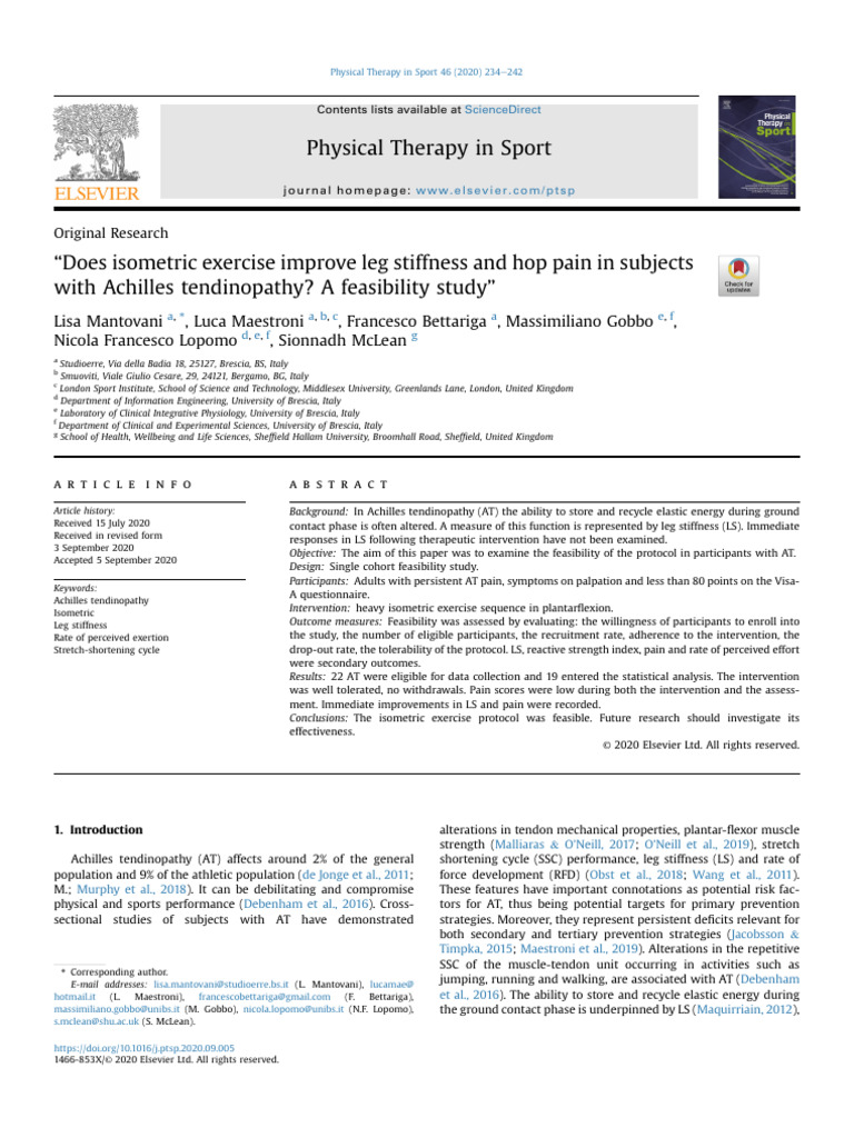 #x201C Does Isometric Exercise Improve Leg Stiffness and Hop Pain in Subjects With Achilles Tendinopathy? A Feasibility Study”