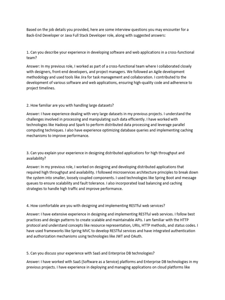 The document outlines potential interview questions and suggested answers for Back-End Developer and Java Full Stack Developer roles, covering topics such as software development experience, handling large datasets, designing distributed applications, and implementing RESTful web services. It emphasizes the importance of understanding Java, Spring frameworks, SQL, and effective communication skills. Additionally, it provides insights into key concepts and best practices that candidates should be prepared to discuss during their interviews.
