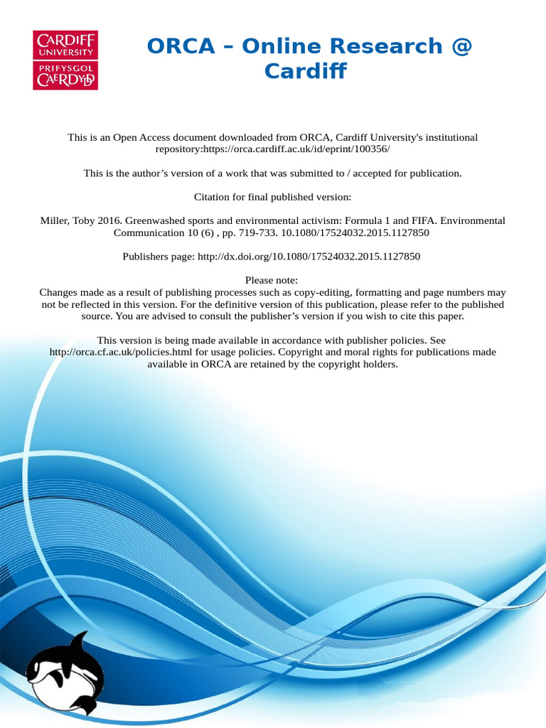 Miller, Toby 2016. Greenwashed sports and environmental activism: Formula 1 and FIFA. Environmental