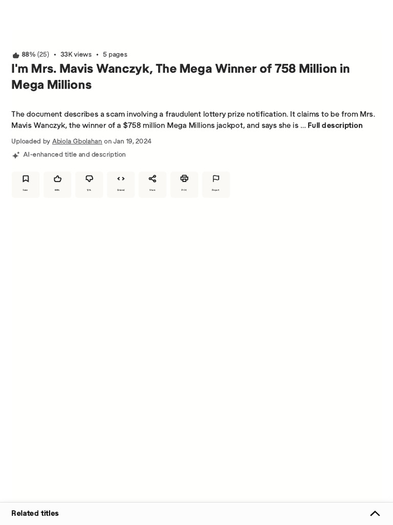 The document describes a scam involving a fraudulent lottery prize notification. It claims to be from Mrs.