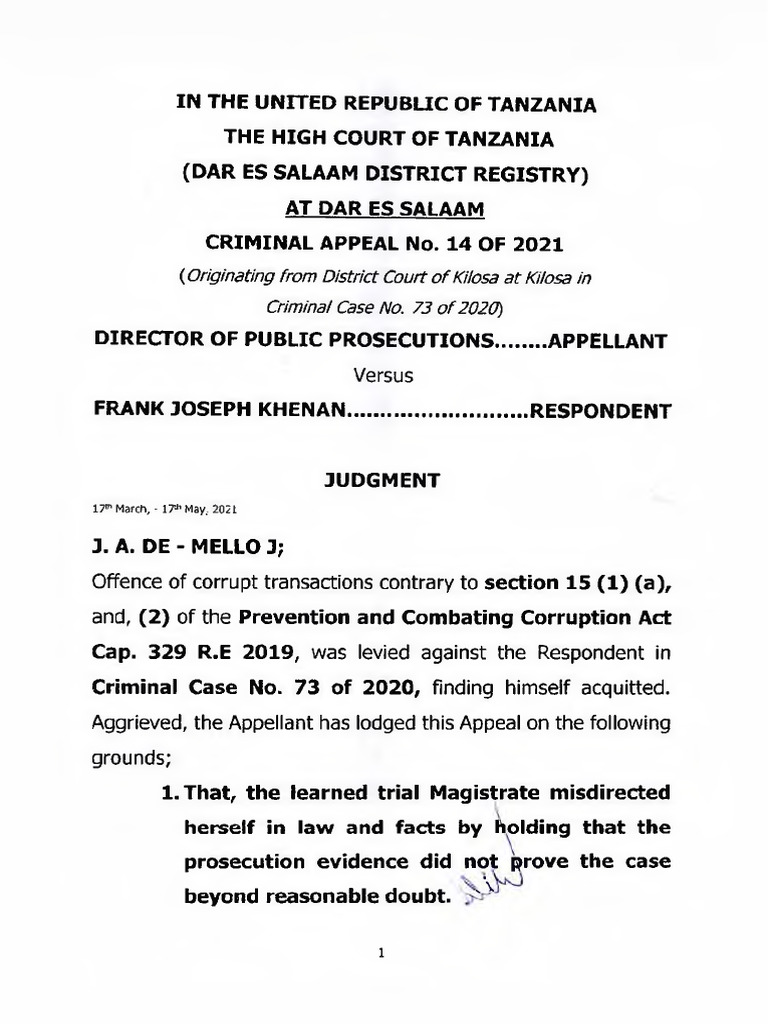 Director of Public Prosecutions Vs Frank Joseph Khenan (Criminal Appeal 14 of 2021) 2021 TZHC 3334 (17 May 2021)