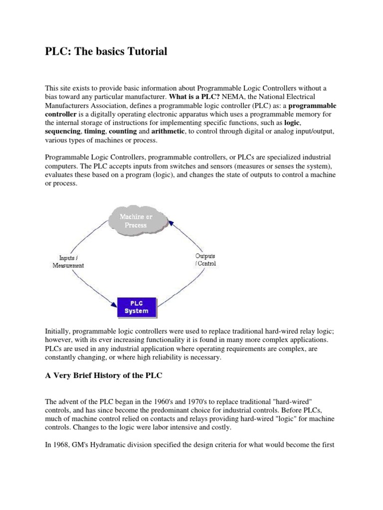 This site exists to provide basic information about Programmable Logic Controllers without a bias toward any particular manufacturer. What is a PLC? NEMA, the National Electrical Manufacturers Association, defines a programmable logic controller (PLC) as: a programmable controller is a digitally operating electronic apparatus which uses a programmable memory for the internal storage of instructions for implementing specific functions, such as logic, sequencing, timing, counting and arithmetic, to control through digital or analog input/output, various types of machines or process. Programmable Logic Controllers, programmable controllers, or PLCs are specialized industrial computers. The PLC accepts inputs from switches and sensors (measures or senses the system), evaluates these based on a program (logic), and changes the state of outputs to control a machine or process.
