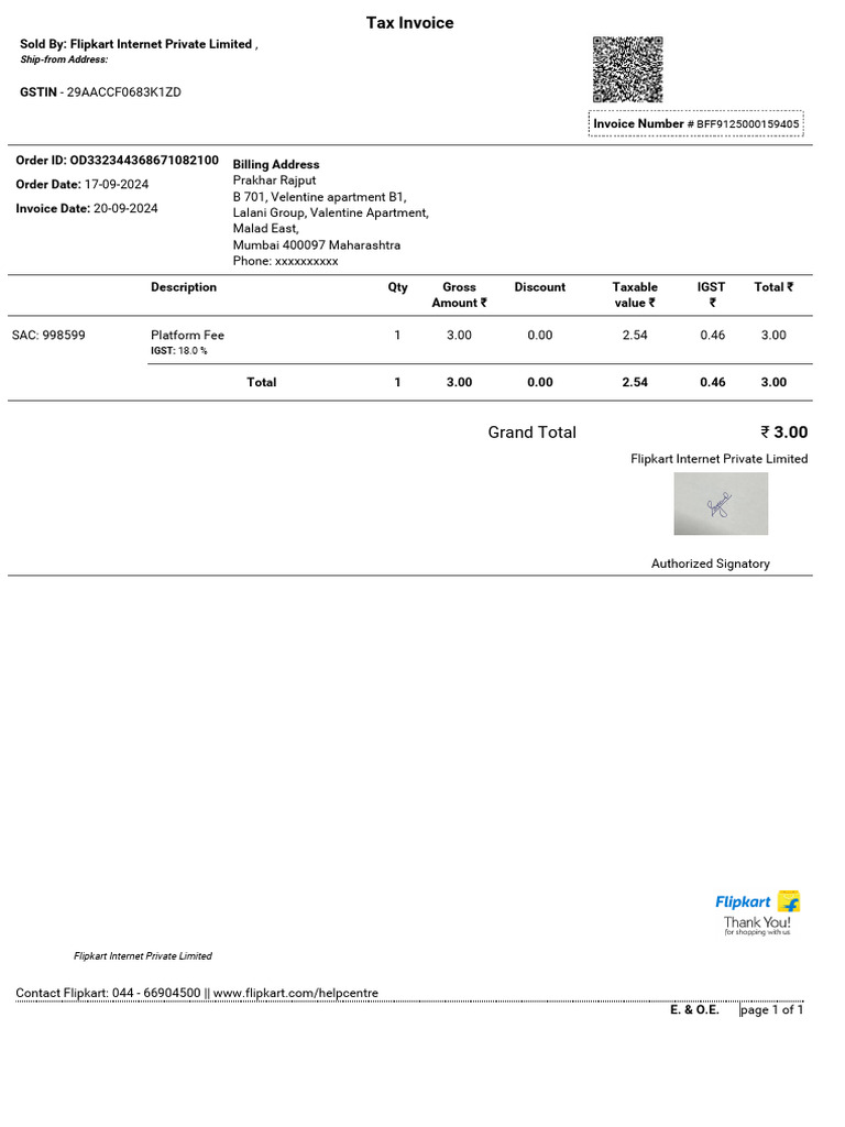 Tax Invoice Order Id: OD332344368671082100 Invoice No: FAA42N2500006462 GSTIN: 09AABCG4316R1Z7