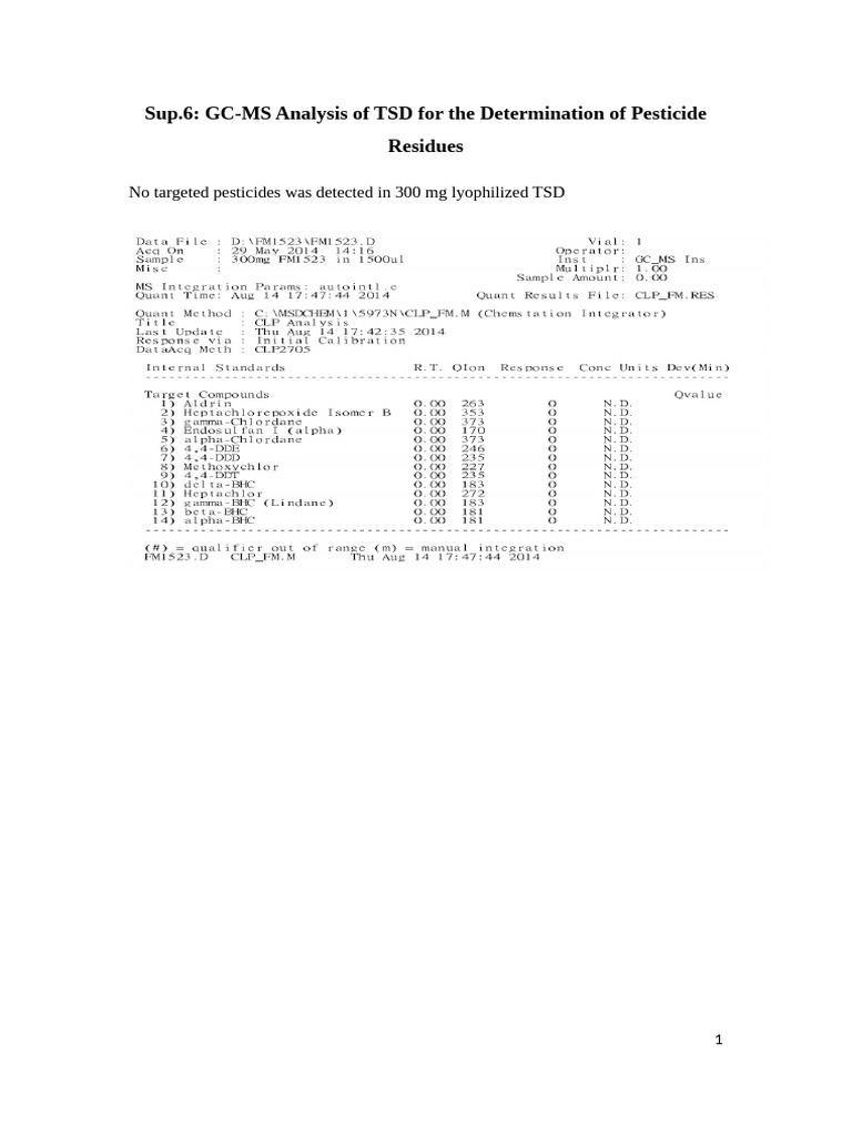 The document reports on a GC-MS analysis of TSD for pesticide residue determination. No targeted pesticides were detected in the 300 mg lyophilized TSD sample. This indicates a lack of pesticide contamination in the tested material.