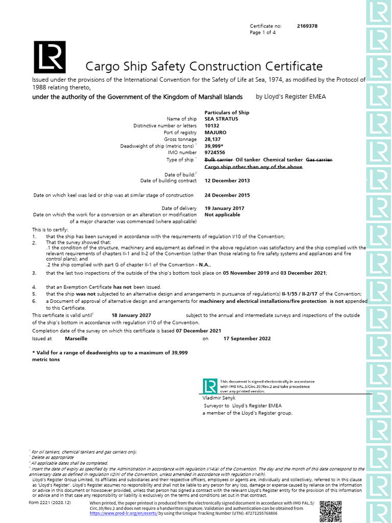 When printed, the paper printout is produced from the electronically signed document in accordance with IMO FAL.5/