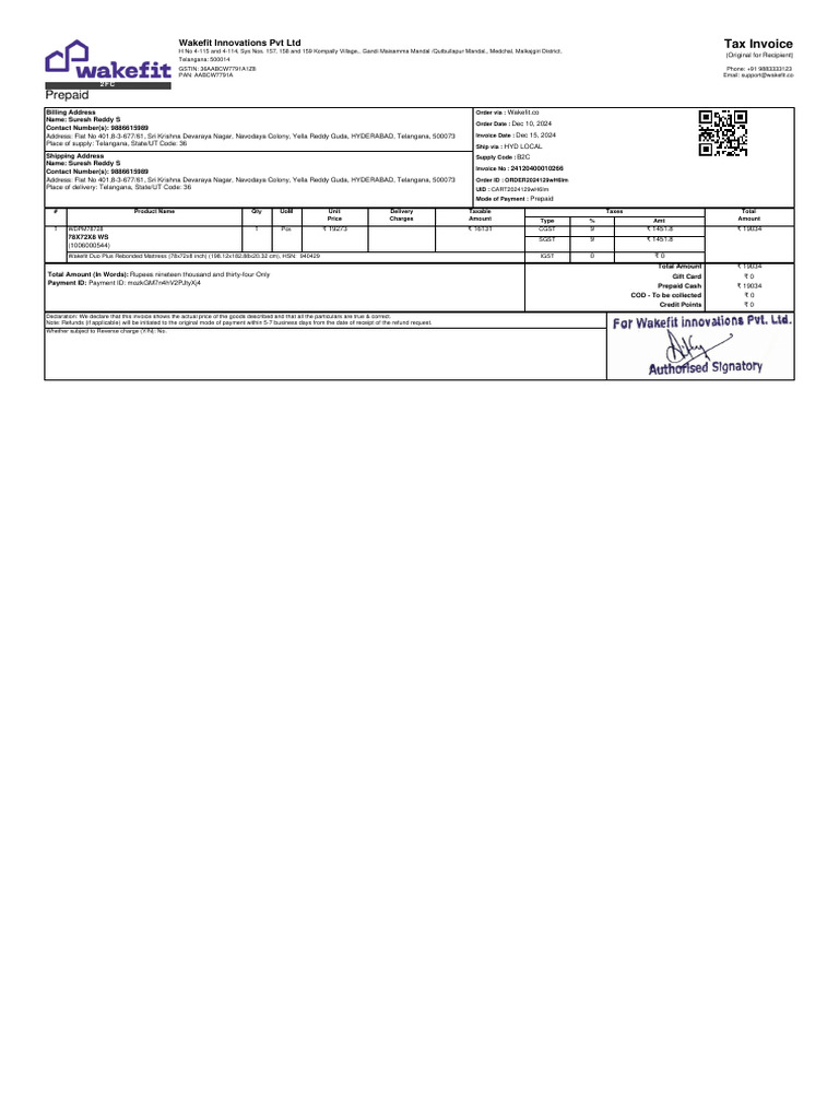 This document is a tax invoice from Wakefit Innovations Pvt Ltd for a mattress purchased by Suresh Reddy S on December 10, 2024. The total amount due is ₹19,034, which includes applicable taxes. The invoice includes details such as billing and shipping addresses, order ID, and payment information.