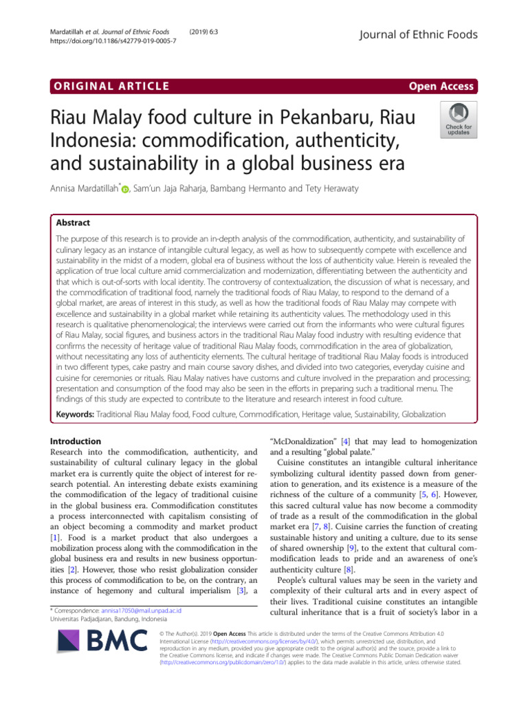 Keywords: Traditional Riau Malay food, Food culture, Commodification, Heritage value, Sustainability, Globalization