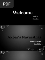 The document discusses the Navratnas of Akbar, a group of nine esteemed individuals in the court of Mughal Emperor Akbar, who ruled from 1556 to 1605. These figures were known for their contributions to arts, administration, and religious tolerance, reflecting Akbar's commitment to unity among diverse communities. Each Navratna had a unique background and role, including poets, military leaders, and scholars, significantly influencing Akbar's reign and policies.