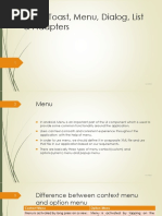 The document provides an overview of Android fragments, mobile devices, and the process of passing data between activities using intents. It explains the types of fragments, the concept of menus in Android applications, and the importance of mobile programming and its lifecycle. Additionally, it discusses dialog boxes, view hierarchy, and the use of Toast for user feedback in mobile applications.