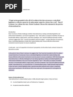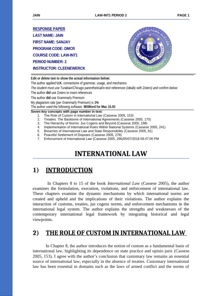 The response paper analyzes Chapters 8 to 15 of Antonio Cassese's book 'International Law,' discussing the formulation, execution, and enforcement of international law. Key concepts include the role of custom, treaties, jus cogens norms, and the interplay between international and national legal systems, highlighting strengths and weaknesses in the current framework. The author emphasizes the importance of non-state actors and the need for further exploration of contemporary challenges in international law.