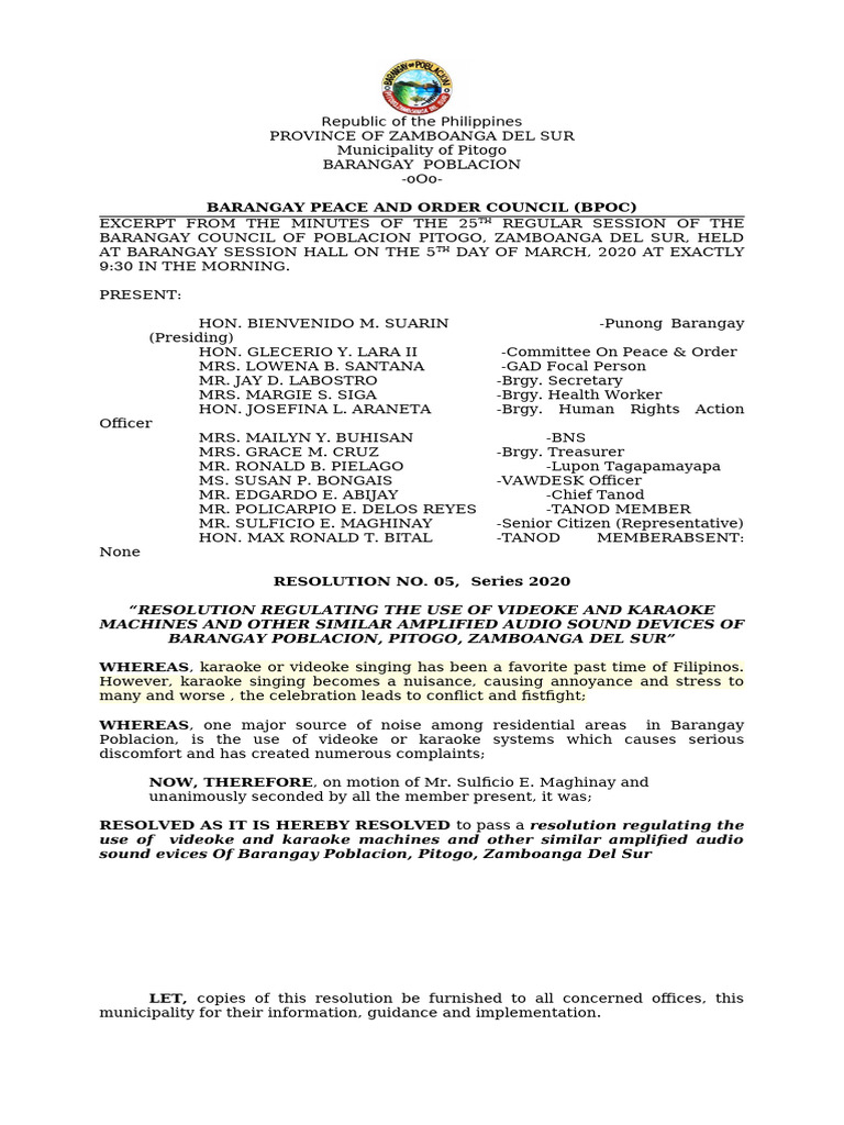BARANGAY COUNCIL OF POBLACION PITOGO, ZAMBOANGA DEL SUR, HELD