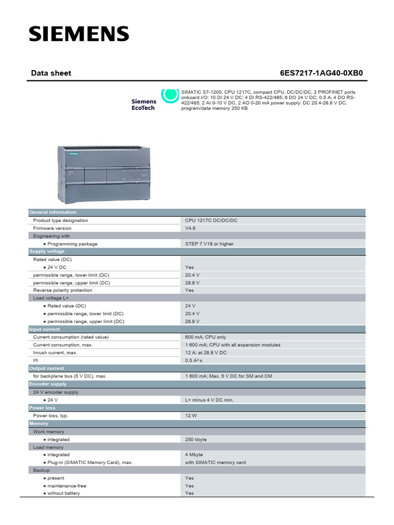 SIMATIC S7-1200, CPU 1217C, compact CPU, DC/DC/DC, 2 PROFINET ports