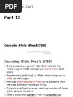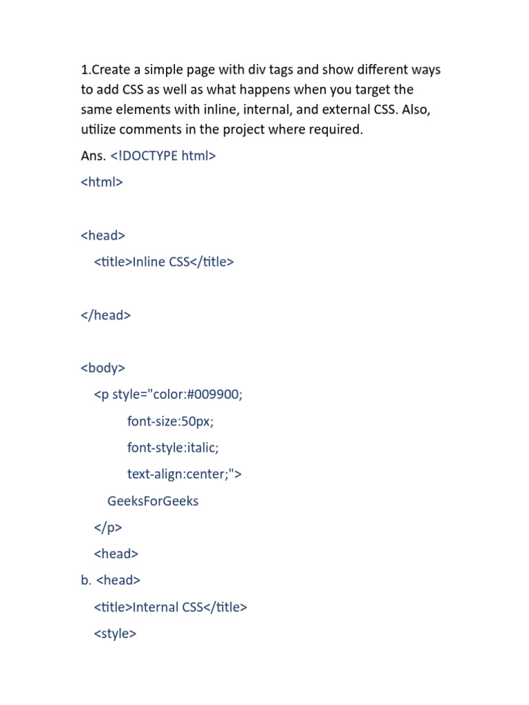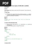 The document provides examples of HTML pages demonstrating different ways to apply CSS, including inline, internal, and external styles. It includes a simple page with styled div tags, multiple paragraphs with unique class names following the BEM convention, and a contact form with styled input elements. Each section is accompanied by relevant CSS rules to illustrate the effects of various styling methods.