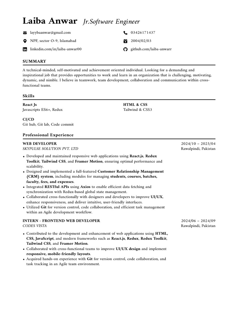 Laiba Anwar is a Jr. Software Engineer with experience in web development, particularly using React.js, Redux, and Tailwind CSS. She has worked on projects like a food ordering app and a data visualization platform for healthcare, showcasing her skills in UI/UX design and API integration. Laiba holds a degree in Software Engineering from PMAS Arid Agriculture University with a CGPA of 3.24.