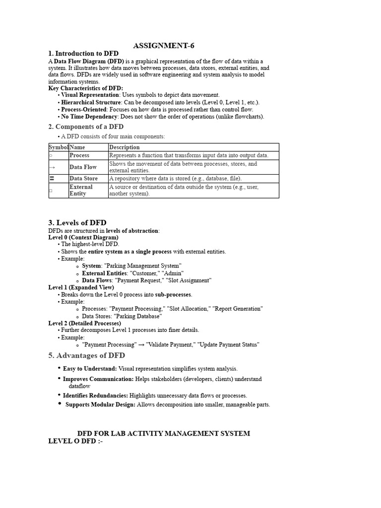The document provides an overview of Data Flow Diagrams (DFDs), which are graphical representations used to model the flow of data within systems. It outlines the key characteristics, components, and hierarchical levels of DFDs, emphasizing their advantages in simplifying system analysis and improving communication among stakeholders. Additionally, it includes examples of DFDs for a Lab Activity Management System at different abstraction levels.