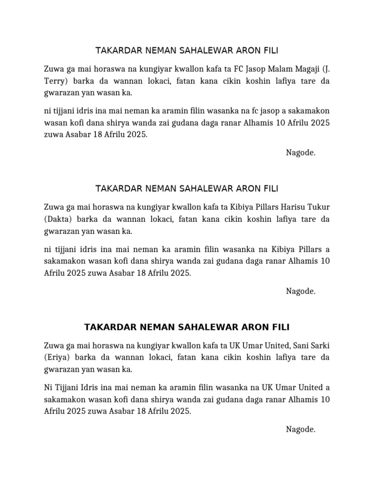 Zuwa ga mai horaswa na kungiyar kwallon kafa ta FC Jasop Malam Magaji (J.