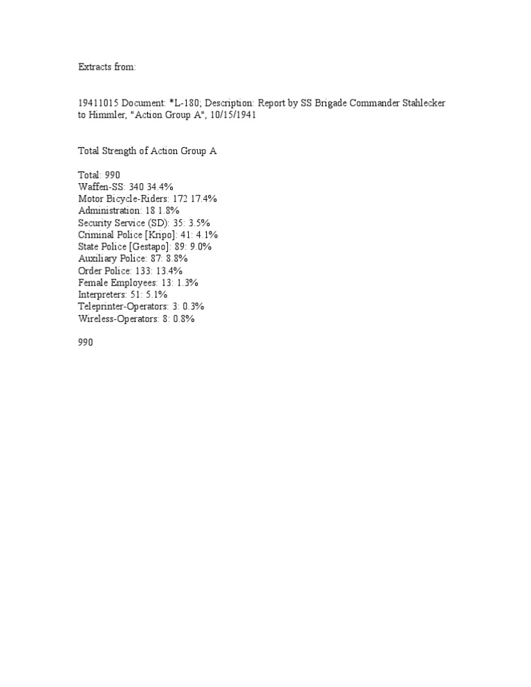 Total Strength of Action Group A Total: 990 Waffen-SS: 340 34.4% Motor Bicycle-Riders: 172 17.4% Administration: 18 1.8% Security Service (SD): 35: 3.5% Criminal Police [Kripo]: 41: 4.1% State Police [Gestapo]: 89: 9.0% Auxiliary Police: 87: 8.8% Order Police: 133: 13.4% Female Employees: 13: 1.3% Interpreters: 51: 5.1% Teleprinter-Operators: 3: 0.3% Wireless-Operators: 8: 0.8% 990