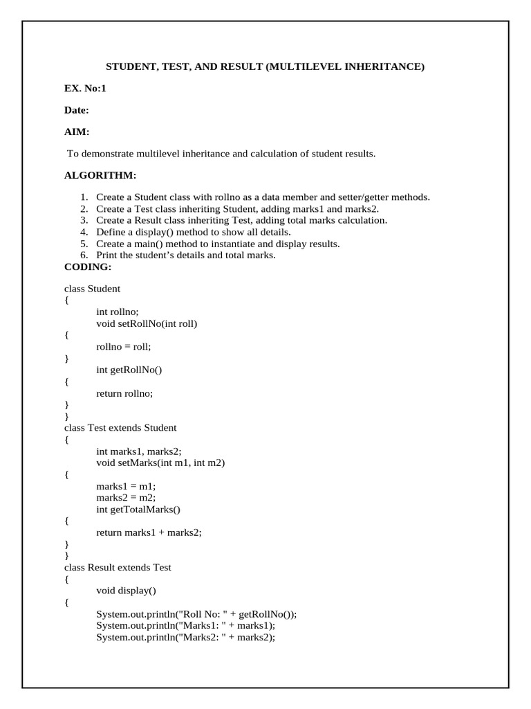 3. Create a Result class inheriting Test, adding total marks calculation.