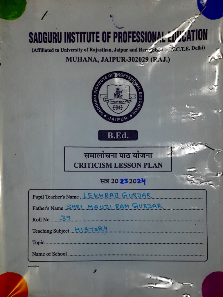 The document appears to be a lesson plan for a B.Ed. program affiliated with the University of Rajasthan. It includes sections for the pupil teacher's name, father's name, roll number, teaching subject, and school name, but lacks specific content or details about the lesson itself. The document is largely unstructured and contains numerous formatting and typographical errors.