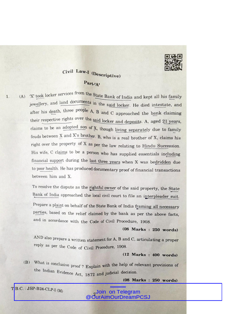 The document outlines a civil law examination paper consisting of various legal questions and scenarios related to civil procedure, evidence, and specific relief. It includes a case study involving a dispute over a bank locker after the death of an individual, requiring the preparation of legal documents and discussions on relevant laws. Additionally, it covers topics such as jurisdiction, admissibility of evidence, and the execution of foreign decrees.