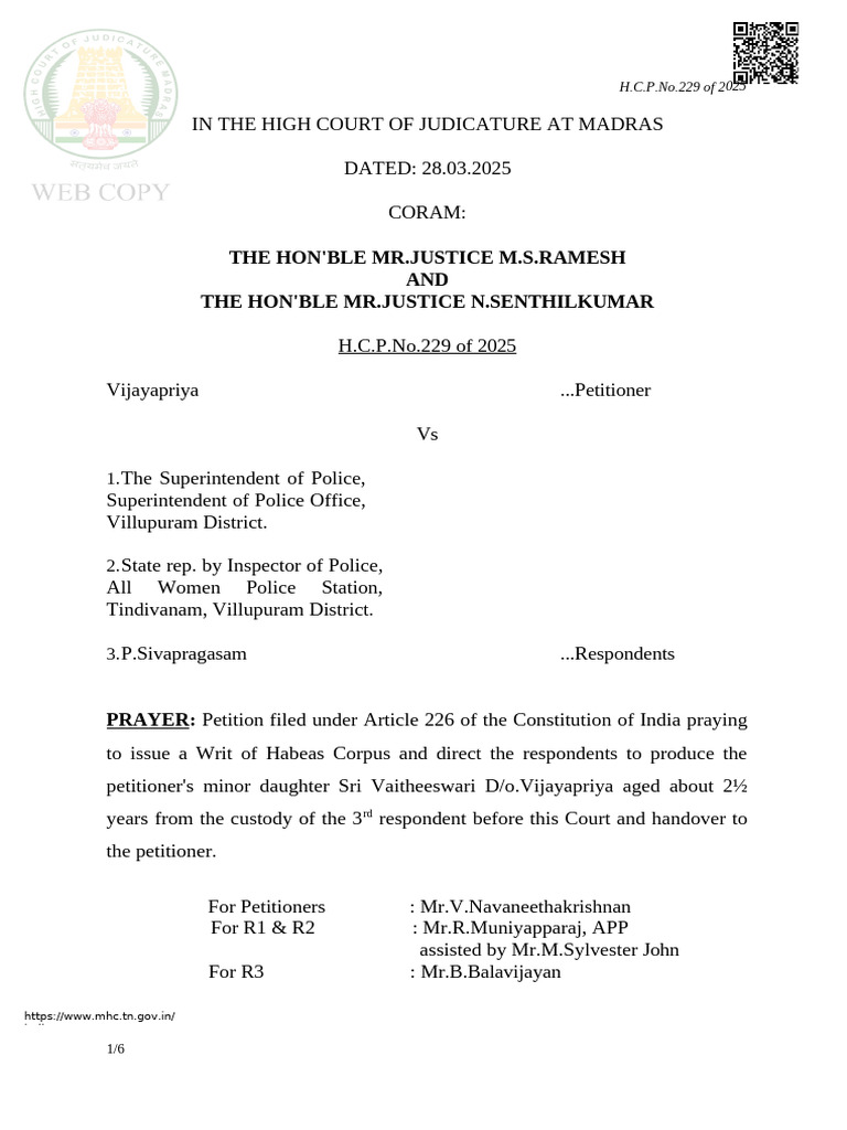 petitioner's minor daughter Sri Vaitheeswari D/o.Vijayapriya aged about 2½