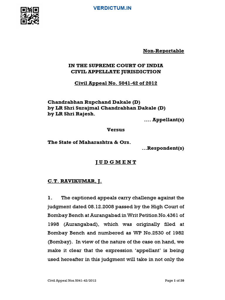 The Supreme Court of India is reviewing Civil Appeals No. 5041-42 of 2012, which challenge a Bombay High Court judgment regarding the surplus land holdings of the appellant, Chandrabhan Rupchand Dakale. The appellant contends that the High Court erred in not considering the cancellation of a compact block notification and the implications of land classification, while the respondents argue that the appellant's claims lack merit and should be dismissed. The case revolves around the interpretation of the Maharashtra Agricultural Lands (Ceiling on Holdings) Act, 1961, and the validity of previous rulings concerning land ownership and transfer.