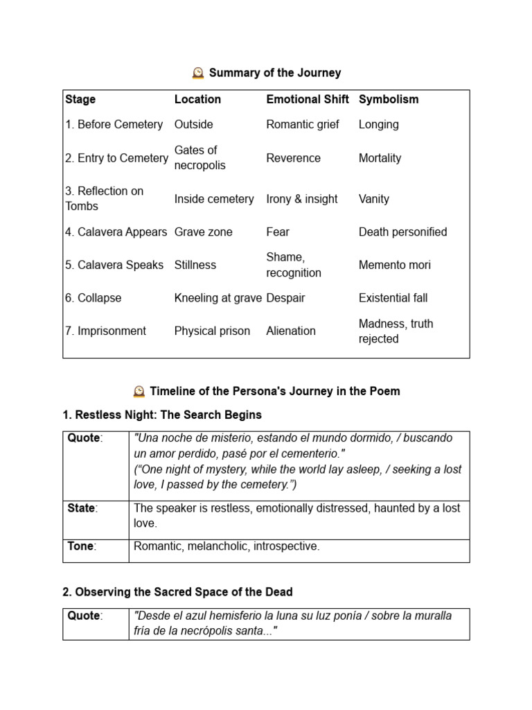 The document outlines a poetic journey through stages of emotional transformation, symbolizing themes of love, mortality, and existential reflection. Each stage captures the speaker's evolving emotions from romantic grief to despair and alienation, marked by encounters with death and the realization of human vanity. The journey culminates in social rejection and confinement, highlighting the tragic consequences of confronting profound truths.