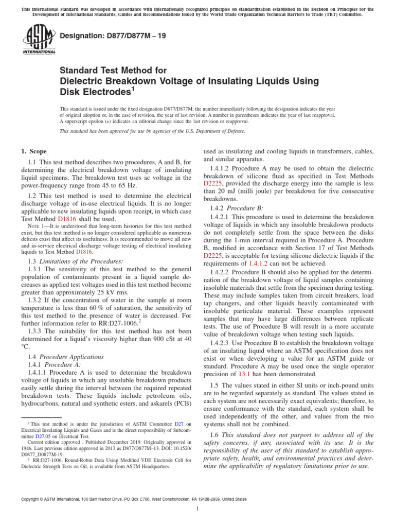 Dielectric Strength Tests on Oil, is available from ASTM Headquarters. mine the applicability of regulatory limitations prior to use.
