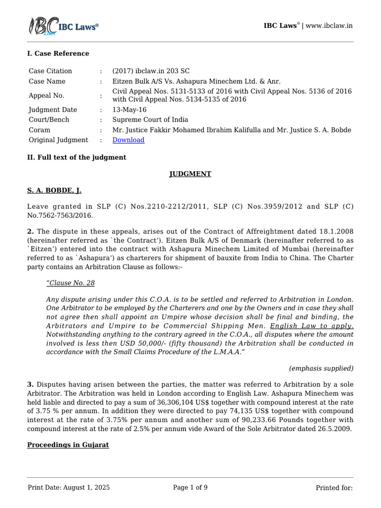 Case Name : Eitzen Bulk A/S Vs. Ashapura Minechem Ltd. & Anr.