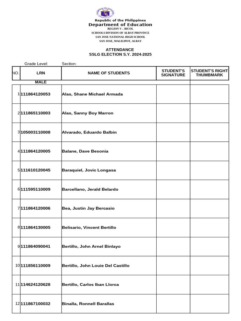 The document is an attendance list for the SSLG election for the school year 2024-2025 at San Jose National High School in the Philippines. It includes the names, learner reference numbers (LRN), and spaces for student signatures and thumbmarks. The list consists of 31 male students from various grade levels.
