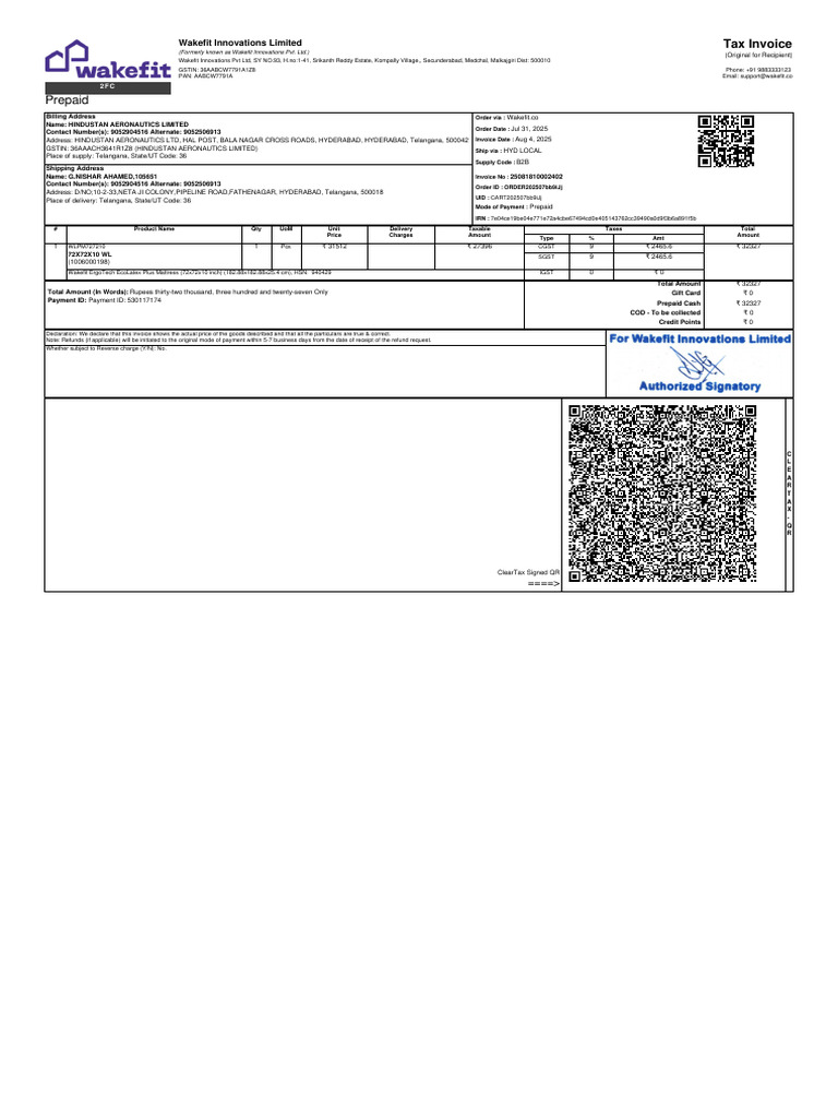 Address: HINDUSTAN AERONAUTICS LTD, HAL POST, BALA NAGAR CROSS ROADS, HYDERABAD, HYDERABAD, Telangana, 500042 Invoice Date : Aug 4, 2025