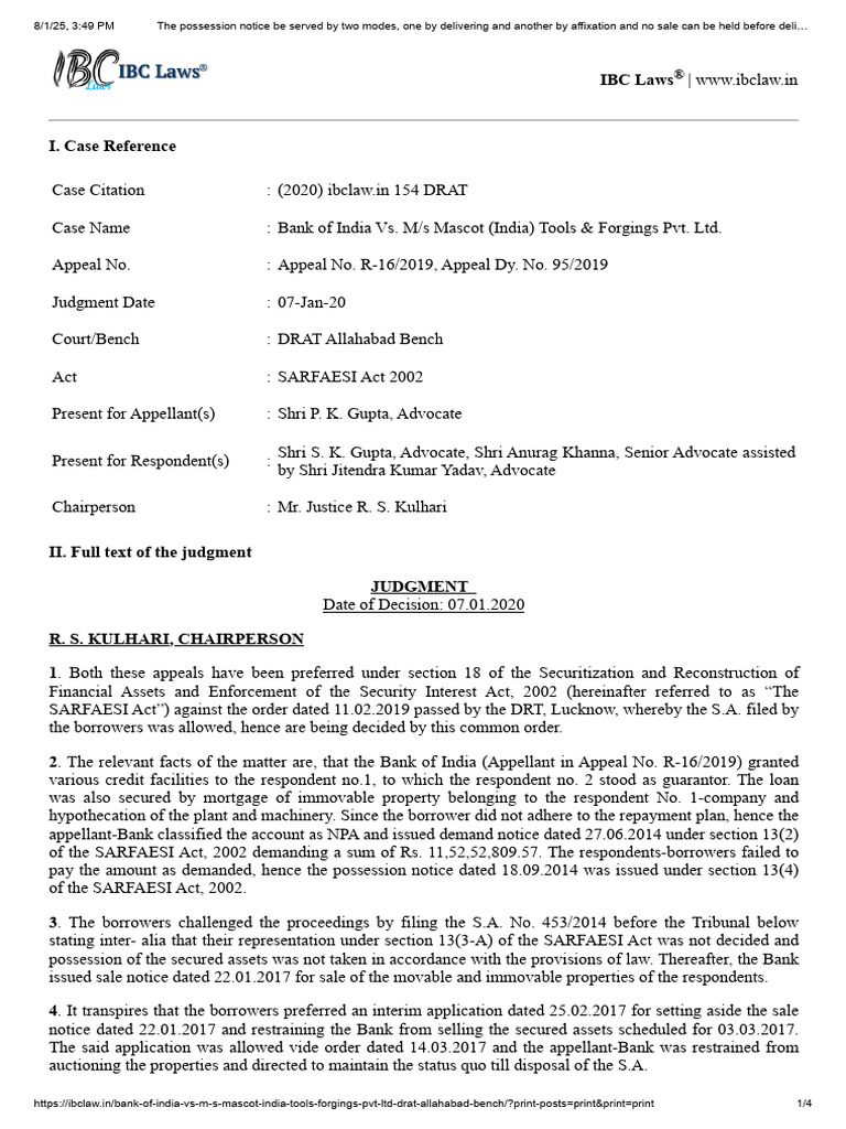 8/1/25, 3:49 PM The possession notice be served by two modes, one by delivering and another by affixation and no sale