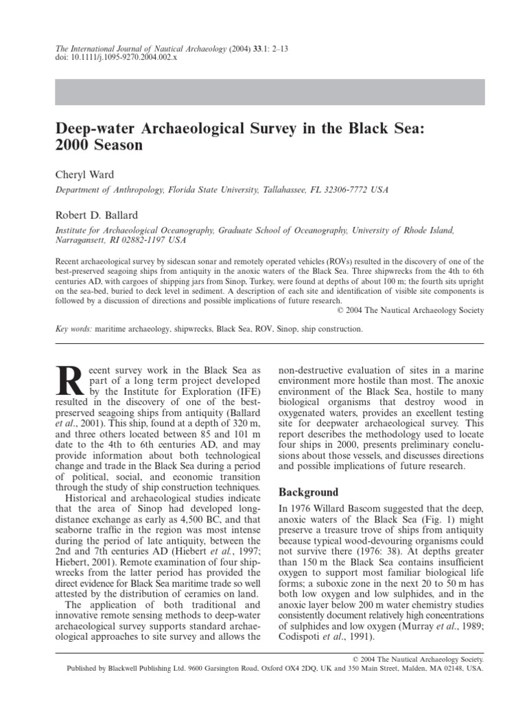F., 2001, Deepwater archaeology of the Black Sea: The 2000 season at Sinop, Turkey, American Journal of Archaeology 105: