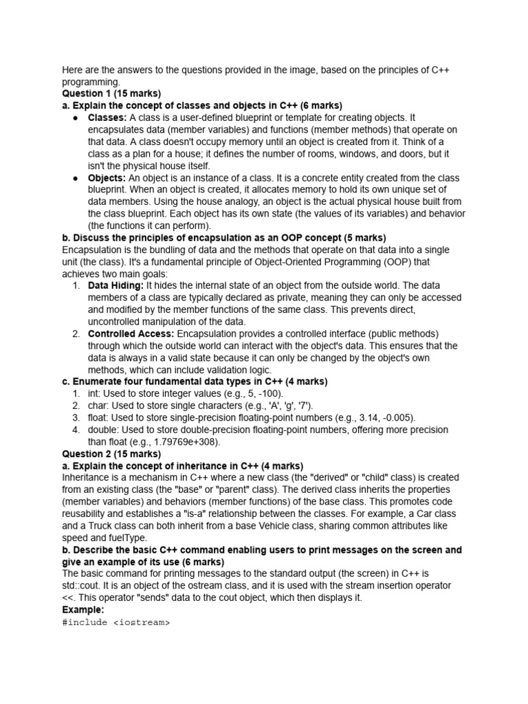 Here are the answers to the questions provided in the image, based on the principles of C++