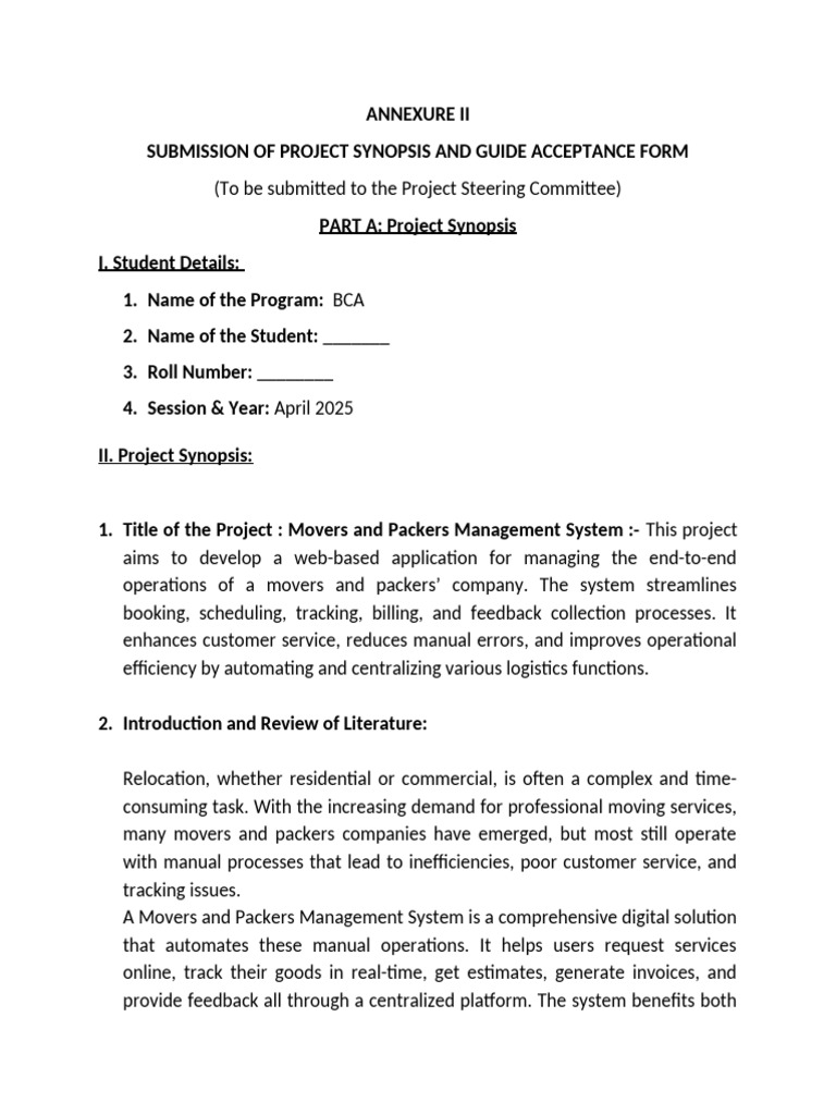 The document outlines a project synopsis for a Movers and Packers Management System aimed at automating logistics operations for a movers and packers company. It includes details on the project's objectives, research methodology, technology stack, and the guide's acceptance form. The project seeks to enhance customer service and operational efficiency through a web-based application that centralizes various logistics functions.