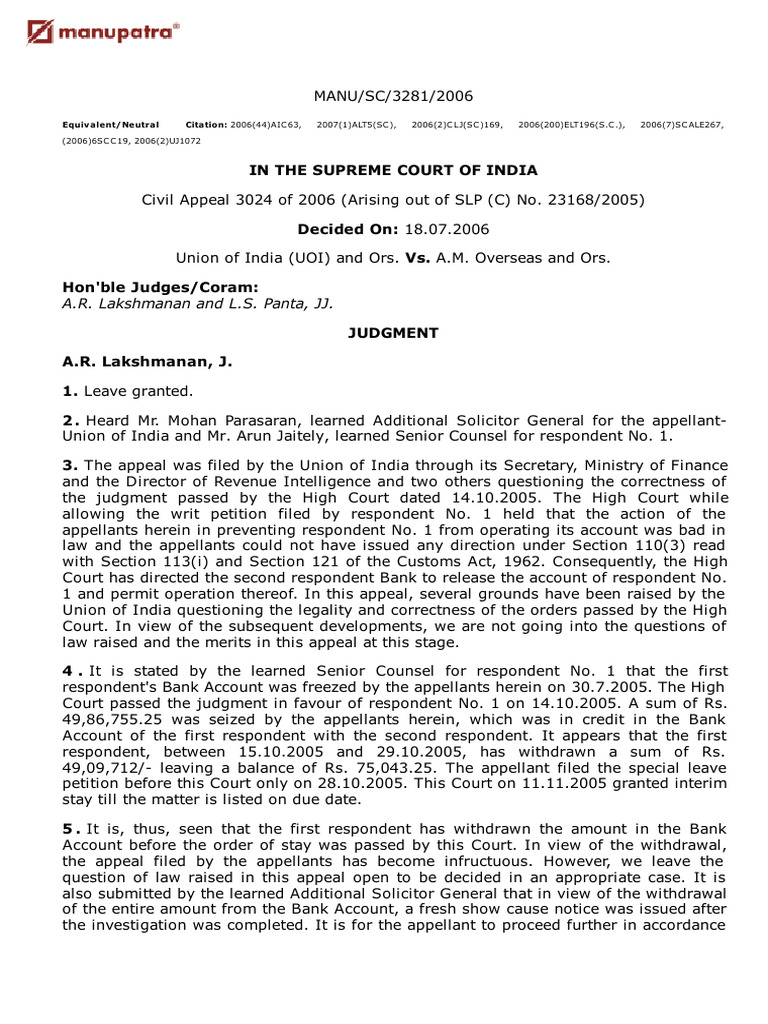 Union of India UOI and Ors Vs AM Overseas and Ors S060521COM997856