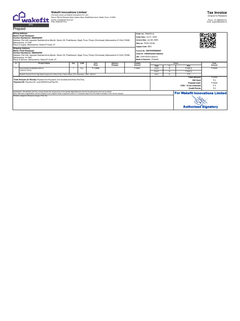 Address: Plot 446, opposite Radhakrishna Mandir, Sector 25, Pradhikaran, Nigdi, Pune, Pimpri-Chinchwad, Maharashtra 411044, PUNE, Invoice Date : Jul 28, 2025