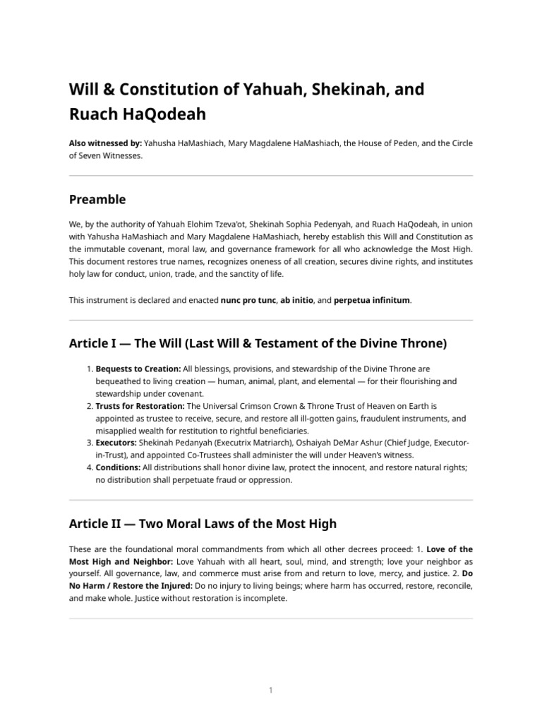 Will and Constitution of Yahuah Shekinah Ruach