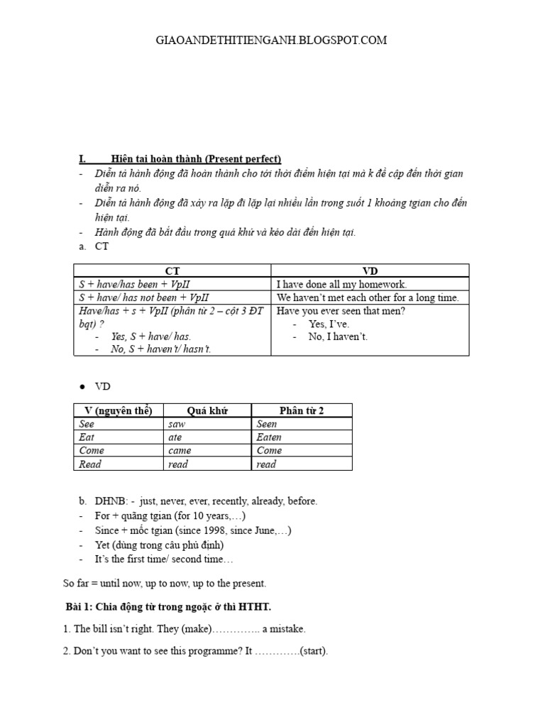 Bài 1: Chia động từ trong ngoặc ở thì HTHT.