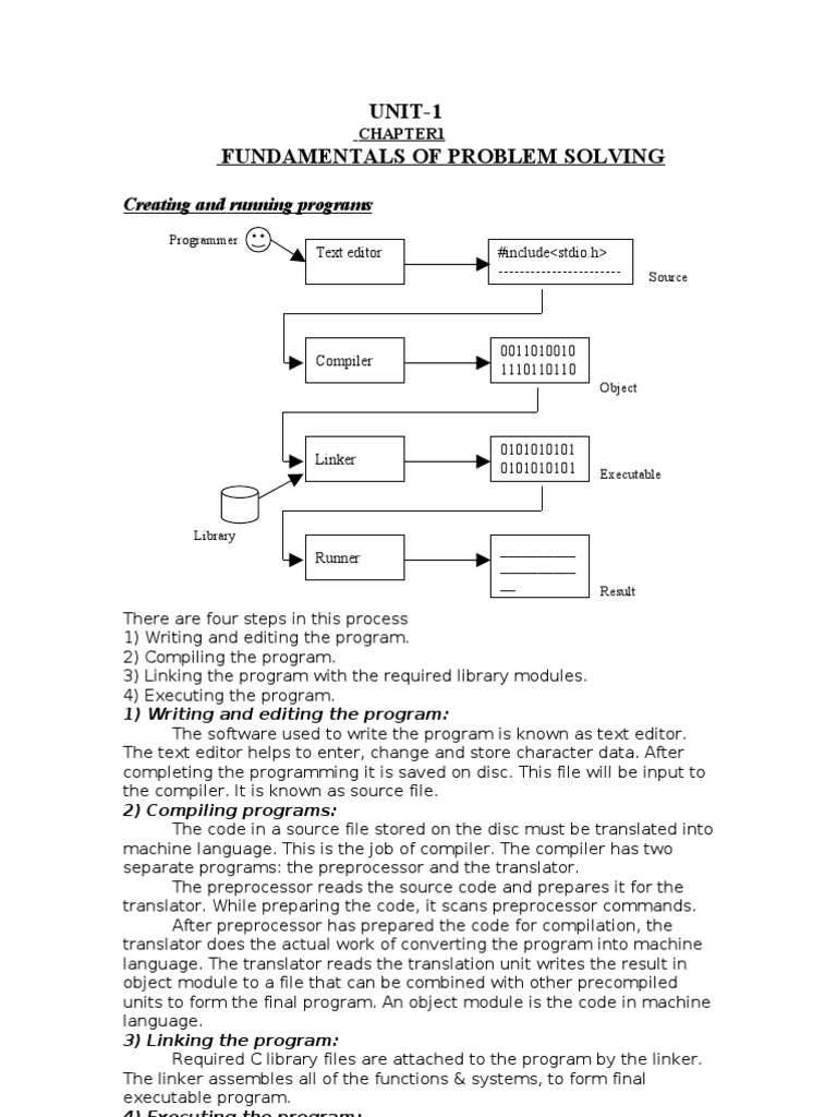 There are four steps in this process 1) Writing and editing the program. 2) Compiling the program. 3) Linking the program with the required library modules. 4) Executing the program. 1) Writing and editing the program: The software used to write the program is known as text editor. The text editor helps to enter, change and store character data. After completing the programming it is saved on disc. This file will be input to the compiler. It is known as source file. 2) Compiling programs: The code in a source file stored on the disc must be translated into machine language. This is the job of compiler. The compiler has two separate programs: the preprocessor and the translator. The preprocessor reads the source code and prepares it for the translator. While preparing the code, it scans preprocessor commands. After preprocessor has prepared the code for compilation, the translator does the actual work of converting the program into machine language. The translator reads the translation unit writes the result in object module to a file that can be combined with other precompiled units to form the final program. An object module is the code in machine language. 3) Linking the program: Required C library files are attached to the program by the linker. The linker assembles all of the functions & systems, to form final executable program. 4) Executing the program: When the program is ready for execution, the operating system command, such as run, is used to load the program into primary memory & execute it. Getting the program into primary memory is the function of operating system program known as loader. When everything is loaded the program takes control & begins execution. Computer concepts & C programming notes by: B Vimalesh Rao 1