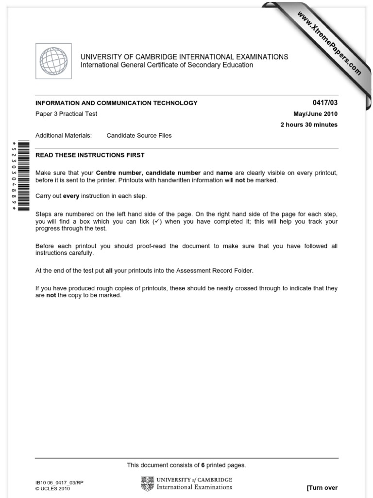 READ THESE INSTRUCTIONS FIRST Make sure that your Centre number, candidate number and name are clearly visible on every printout, before it is sent to the printer. Printouts with handwritten information will not be marked. Carry out every instruction in each step. Steps are numbered on the left hand side of the page. On the right hand side of the page for each step, you will find a box which you can tick ( ) when you have completed it; this will help you track your progress through the test. Before each printout you should proof-read the document to make sure that you have followed all instructions carefully. At the end of the test put all your printouts into the Assessment Record Folder. If you have produced rough copies of printouts, these should be neatly crossed through to indicate that they are not the copy to be marked.