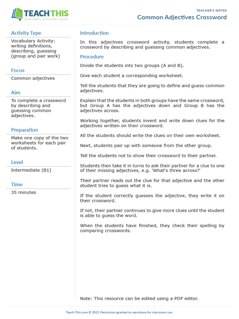 Vocabulary Activity: In this adjectives crossword activity, students complete a