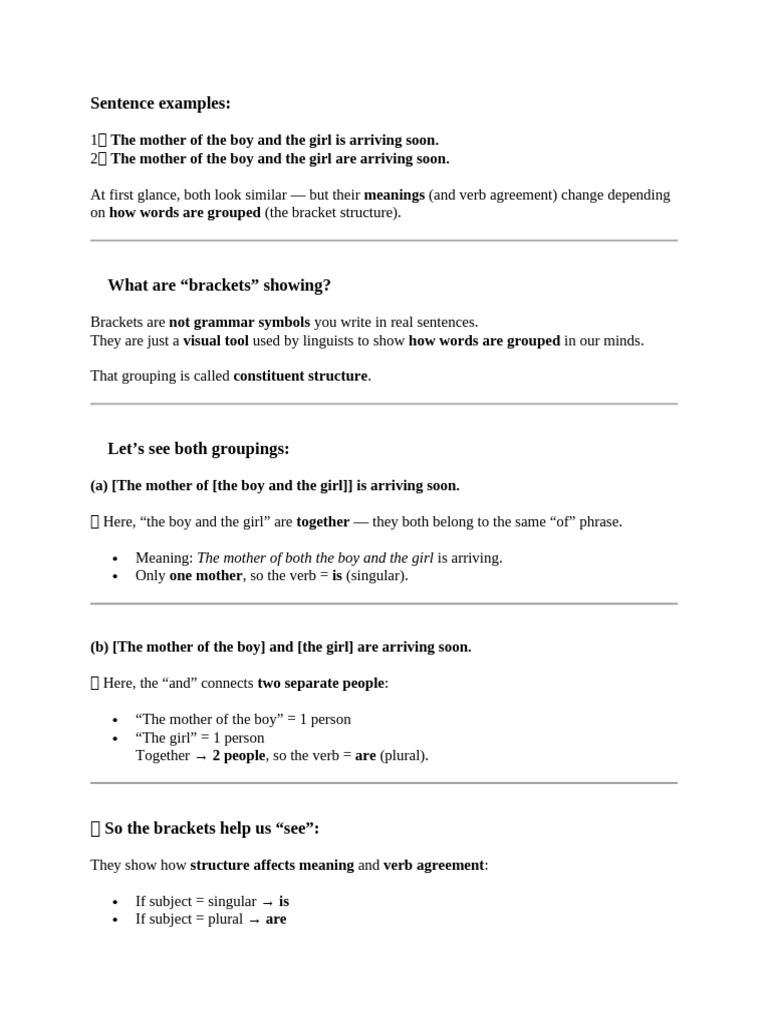 2. [[The mother of the boy] and [the girl]] → two people are arriving (verb are).