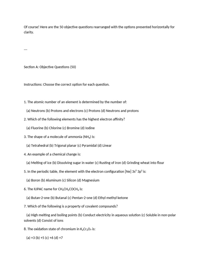Here are the 50 objective questions rearranged with the options presented horizontally for
