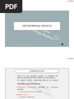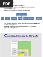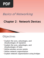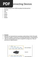 This document discusses several common networking devices. It begins by explaining that a hub is a common connection point that connects network segments, but simply copies packets to all ports, wasting bandwidth. A switch inspects packet headers and only forwards packets to their destination port, improving efficiency. A repeater regenerates signals to extend distance on a network, while a bridge filters traffic and connects network segments at the data link layer. The document contrasts key differences between hubs and switches, and between repeaters and bridges. It then provides brief definitions of 14 additional common networking devices including routers, bridges, multilayer switches, and network cards.