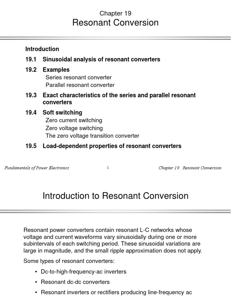 Simple steady-state analysis via sinusoidal approximation Simple and exact results for the series and parallel resonant converters Mechanisms of soft switching Resonant inverter design techniques. Circulating currents, and the dependence (or lack thereof) of conduction loss on load power